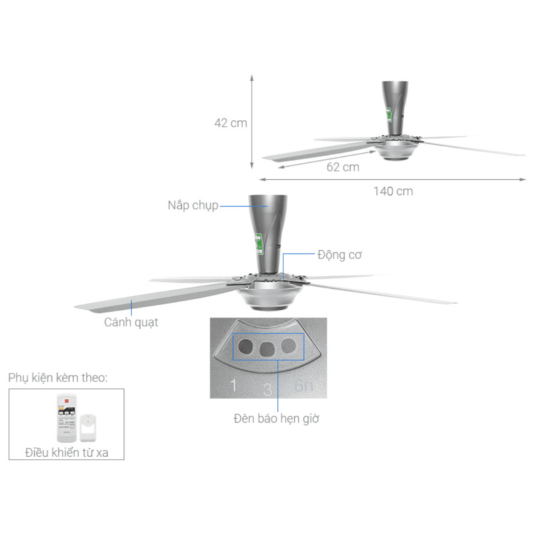 – Thiết kế hiện đại, sang trọng: Màu bạch kim (SIL) thời thượng, 4 cánh quạt sải 140cm, mang lại vẻ đẹp tinh tế, phù hợp với mọi phong cách nội thất.